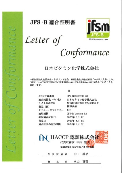 この度、日本ビタミン化学株式会社は一般財団法人食品安全マネジメント協会(JFSM)が策定する、「JFS-B規格」を取得いたしました。